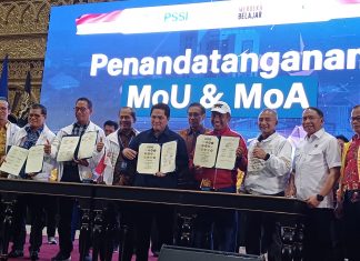 SURABAYA—Universitas Negeri Surabaya (UNESA), menandatangani nota kesepahaman atau Memorandum of Understanding (MoU) dengan Persatuan Sepak Bola Seluruh Indonesia (PSSI) di sela-sela Kuliah Umum bersama Erick Thohir di Graha UNESA, Kampus Lidah Wetan, Surabaya, pada Jumat, 8 September 2023.