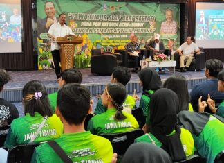 SURABAYA - Atlet dan pelatih pemusatan latihan daerah (Puslatda) Jatim proyeksi PON XXI/2024, di DI Aceh dan Sumatera Utara (Sumut), menerima siraman motivasi dari pakar komunikasi dan motivator nasional, Aqua Dwipayana.